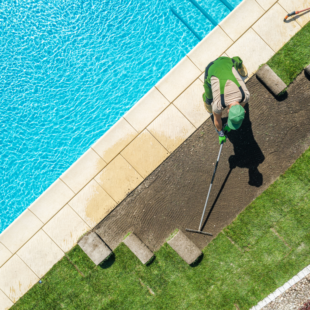 - Implantation : terrasses, piscines, bordures, murets, massifs, réseaux d’arrosage/éclairage.