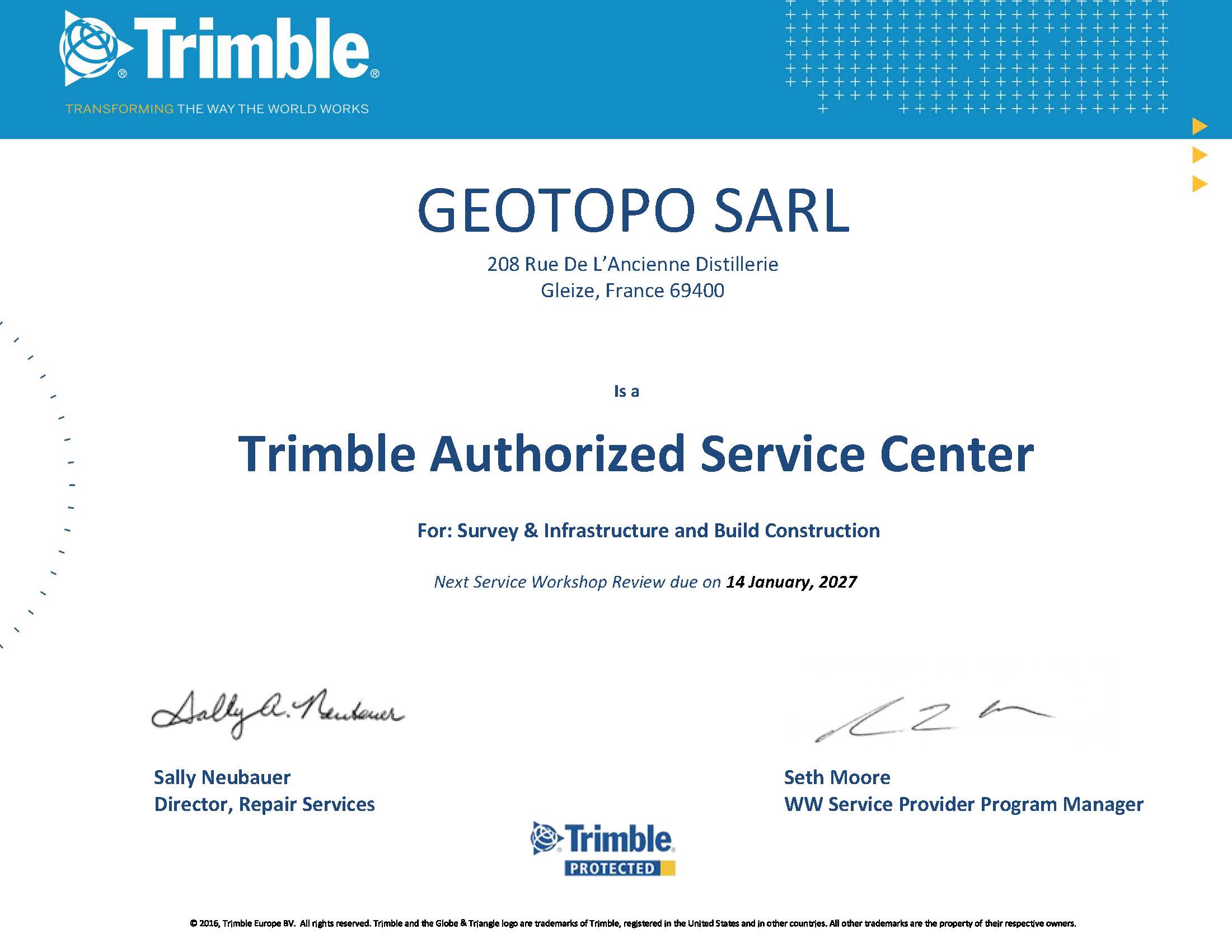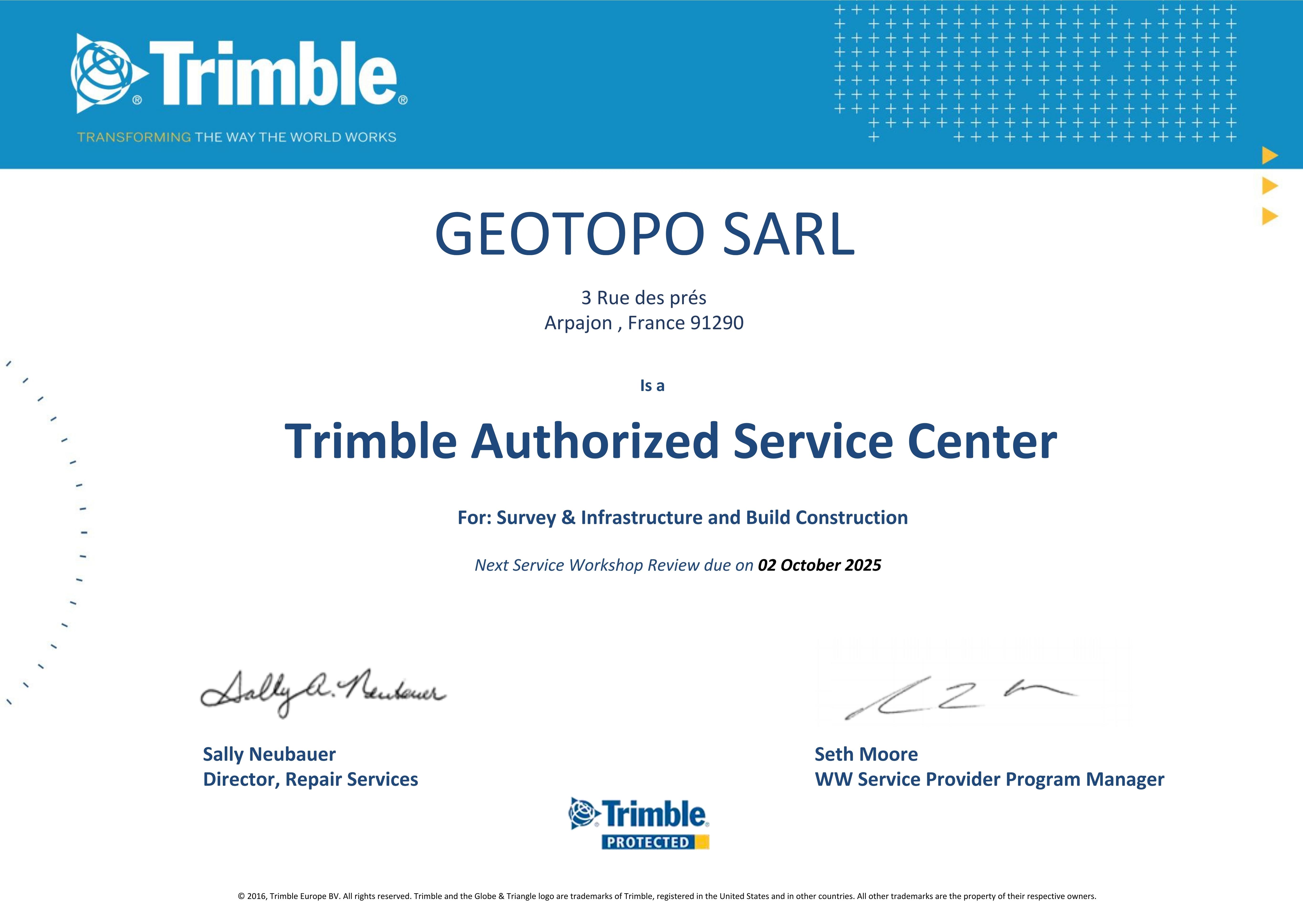 Seuls les services techniques agrées par Trimble sont habilités à réaliser une intervention (contrôle, révision, réparation), sur un instrument Trimble, et à délivrer un certificat de conformité aux spécifications constructeurs.